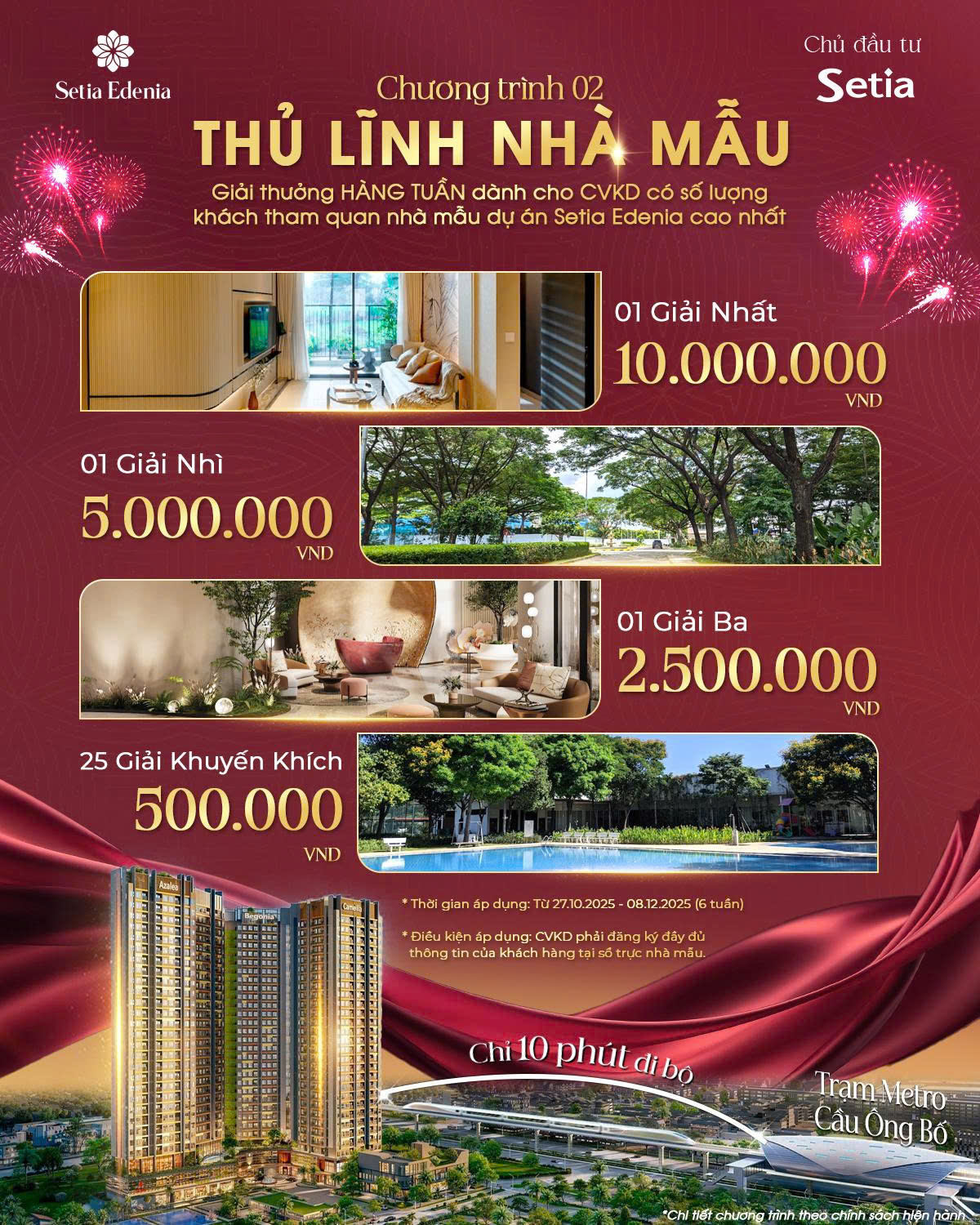 * Một “Tuần” được tính từ 09:00 sáng Thứ Hai đến 19:00 chiều Chủ Nhật. - Thời điểm trao giải: Sáng thứ 3 mỗi tuần tại nhà mẫu dự án Setia Edenia